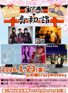 2026年1月23日(金) CrazyMonkey × ナデシコドール presents 「新春☆音初詣」⛩️ 開場18:00 開演18:30 前売¥2,500 当日¥3,000 (1d¥600) 【出演】 ナデシコドール FLIP OUT インクと妄想 Dusk Echo LuXuRiA