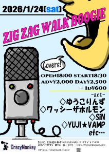 2026年1月24日(土) ~Covers~ ZIG ZAG WALK BOOGIE 開場18:00 開演18:30 前売¥2,000 当日¥2,500 (1d別途¥600) 【出演】 ゆうこりんず ワッシーザホルモン SiN YUJI★VAMP 他